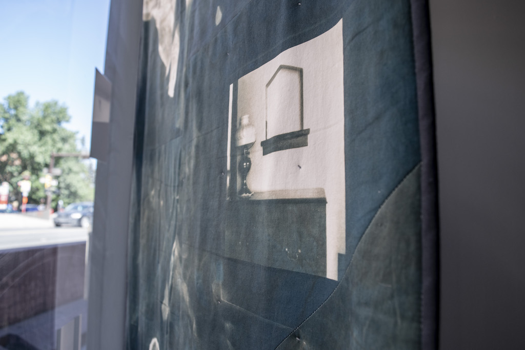 Detail from Echo on the Landing, 2022. Cyanotype on cotton fabric, embroidery, cotton batting. Image courtesy of the artist.