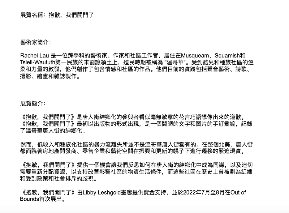 Sorry, We’re Open is an invitation to reflect on how we may be complicit in gentrification in Chinatown and the urgent need to redistribute resources to support the improvement of material living conditions affecting communities that have been historically redlined and discriminated against through policy and social exclusion.