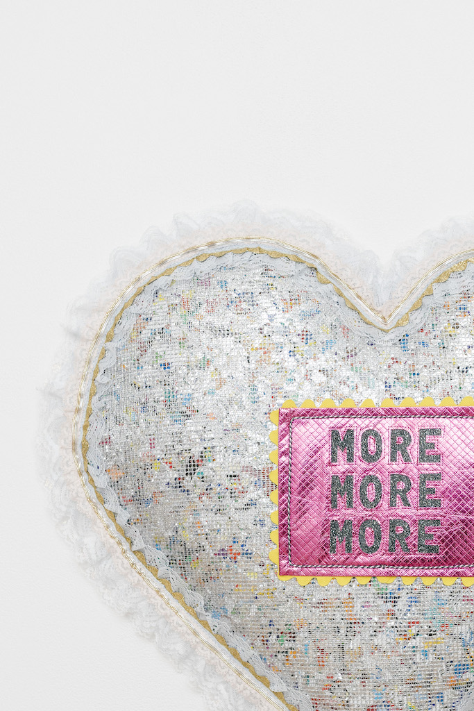 畫廊地面上陳列著本次展覽中最大的作品。觀衆受邀坐上或躺在For Every Feeling Ever Felt, 2023上,一件介于雕塑與家具之間的作品。其明亮、心形的外觀帶著甜膩的溫柔,邀請我們去觸碰與倚靠,在展覽空間中提供片刻的休憩。堆疊在這件作品(For Every Feeling I Ever Felt)之上的靠墊,是以二手商店的毛線與珠子機織而成,爲作品增添了更多的感官愉悅與互動的可能,讓我們得以真正地把頭埋進云端。在我看來,這些作品最能體現Richardson作爲藝術家所貫穿始終的那份關懷。她細致地清潔、整理,並重新利用自己生活與工作中産生的柔軟塑料廢料與被棄物,將它們填充進這些雕塑里。通過這一過程,她不僅對材料懷有體貼的共情,也將這種情感傳遞給觀看作品的人。