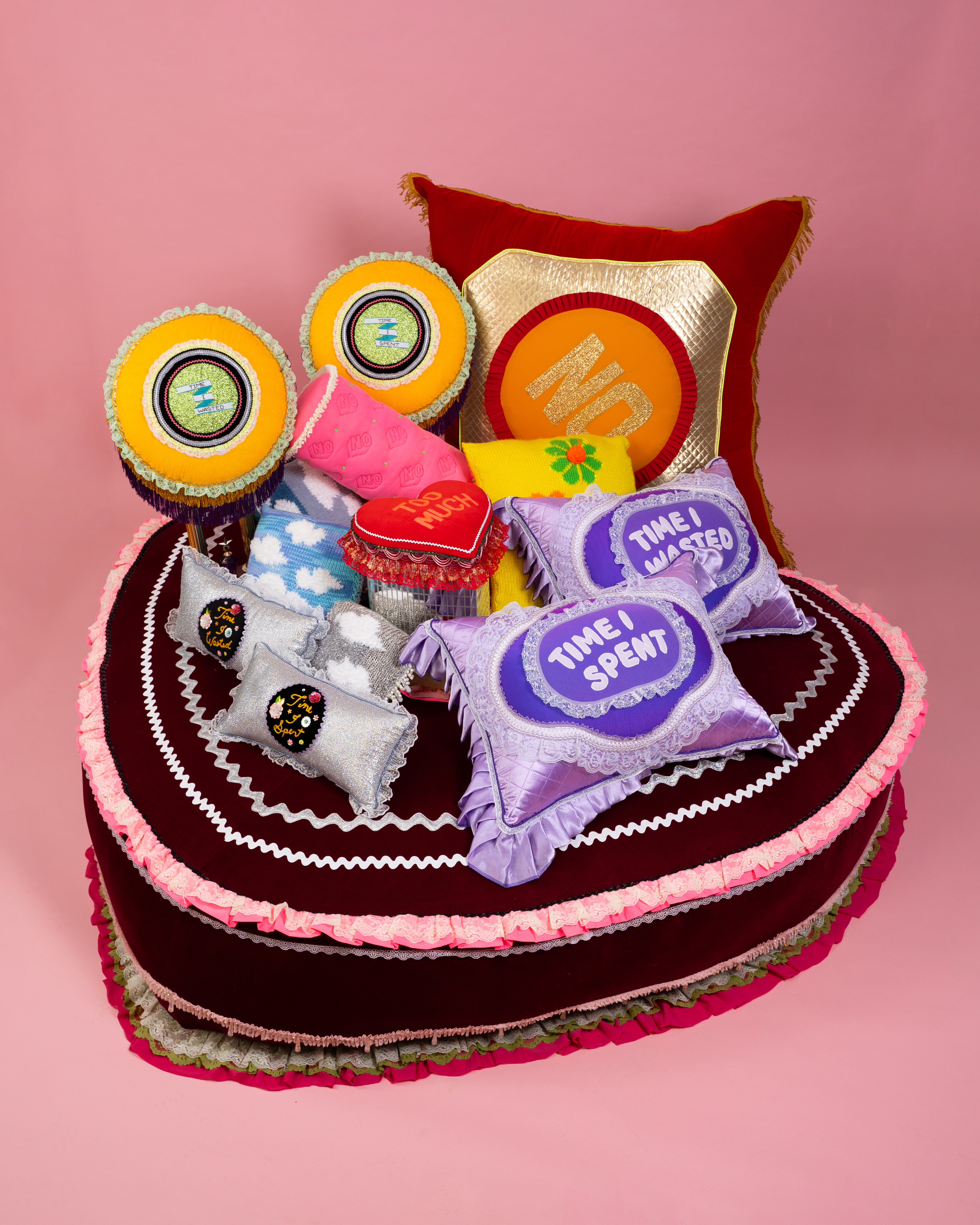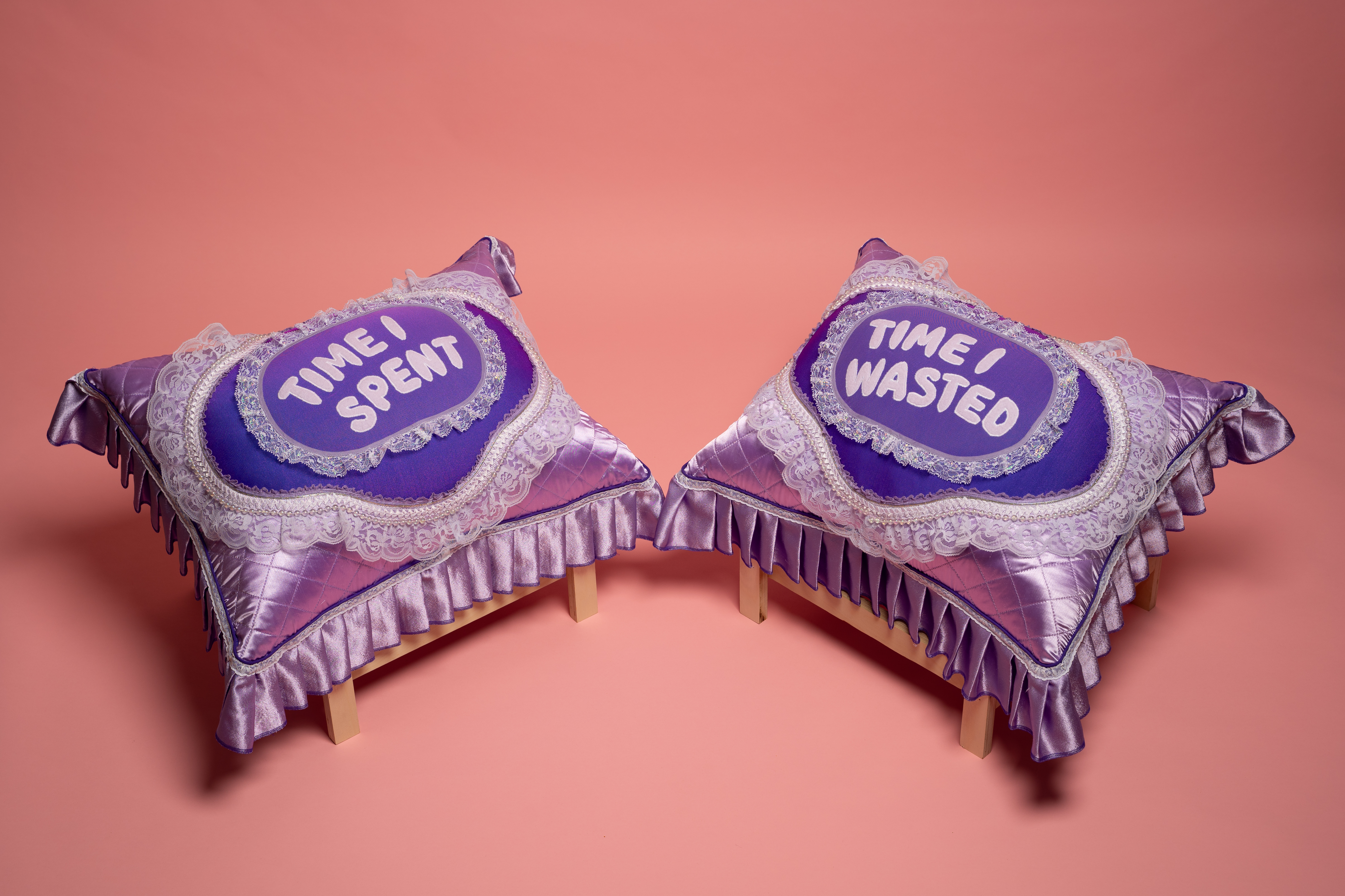 Pillows, at first an obsession, became a metaphor for all the ways I have tried to compartmentalize and process difficult events or emotions in my life. They are absurdist facsimiles of familiar domestic objects meant to provide ornamental distraction and comfort, a place to carry and hold all that I don’t want to, a fantasy vision of a place to land.