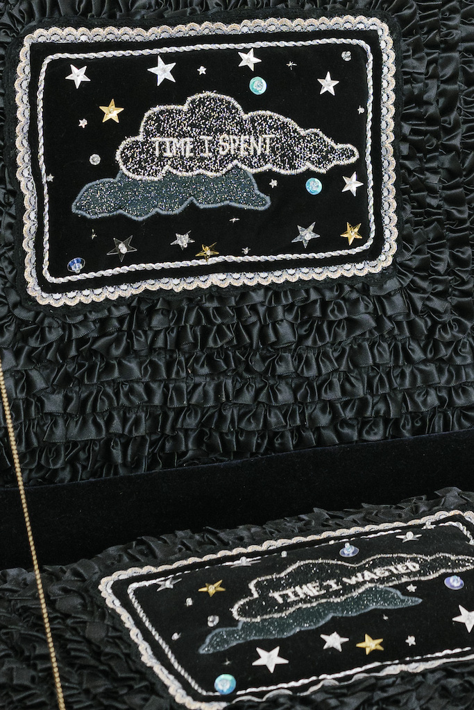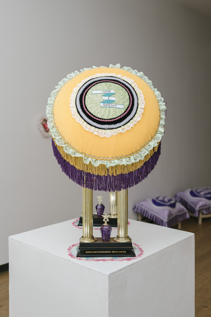 In Surface all the way through, Arianna Richardson plays with and heightens the forms and stylings of mass-produced kitsch objects in her one-of-a-kind sculptures, encouraging us to confront our multifaceted relationships with plastic goods. Across the gallery are several sculptures within a series (Time I Spent & Time I Wasted, 2022-Ongoing), each emblazoned with the phrases “Time I spent” and “Time I wasted”. The openness of these statements combined with the specificity of the objects they are a part of (from pillows to suitcases to trophy bases) brings into focus the contradictions at the heart of this work. What is the value we ascribe to the materials, labour, and time necessary for this artwork to exist? How might we reconcile the effort expended to create these objects of beauty out of disposable and mundane artifacts, especially in today's fast-paced, product-focused, and consumer-centric landscape?